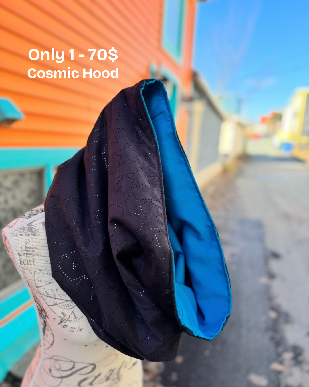 Protect your crown in the majesty of the cosmos with this stunning hood. The exterior shimmers with stars and gold, like a celestial canvas unfolding above. Beneath, a rich blue interior evokes the mystery of the night sky. Crafted with a thicker, longer design, this hood is both a statement piece and a sanctuary. Let the stars guide you.