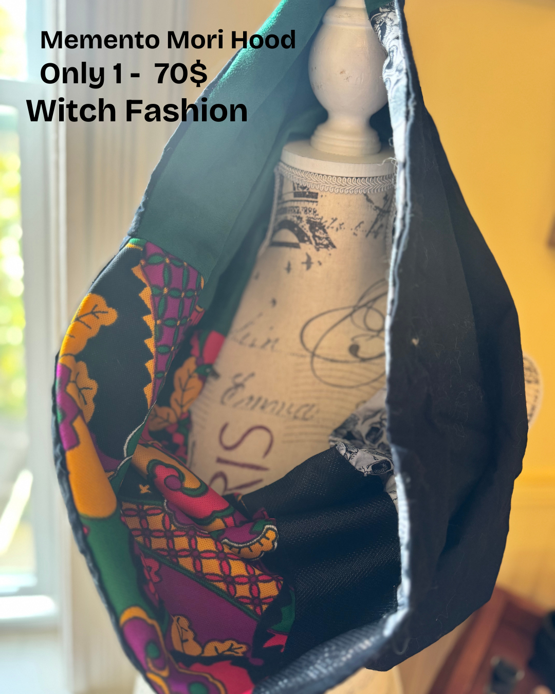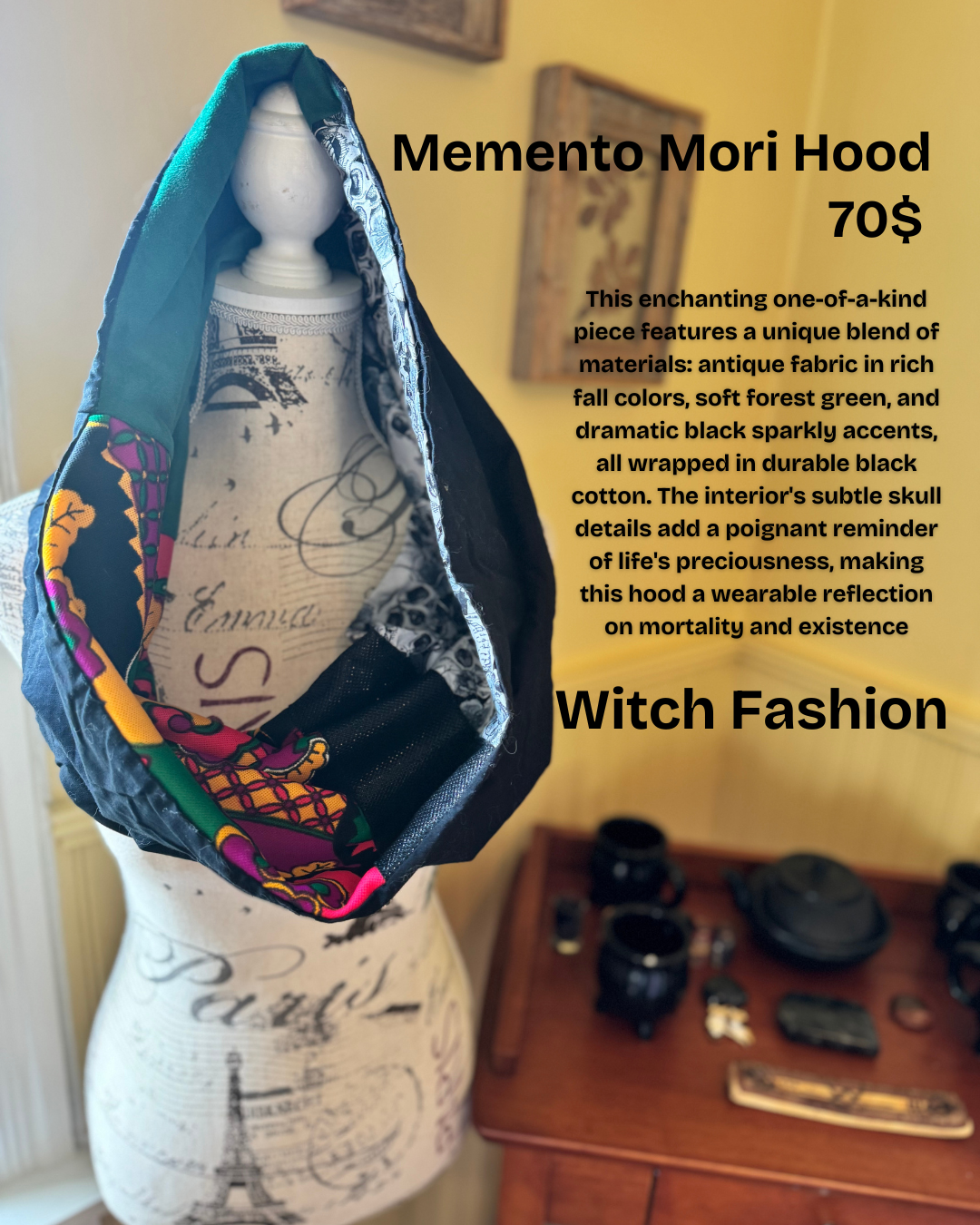 This enchanting one-of-a-kind piece features a unique blend of materials: antique fabric in rich fall colors, soft forest green, and dramatic black sparkly accents, all wrapped in durable black cotton. The interior's subtle skull details add a poignant reminder of life's preciousness, making this hood a wearable reflection on mortality and existence