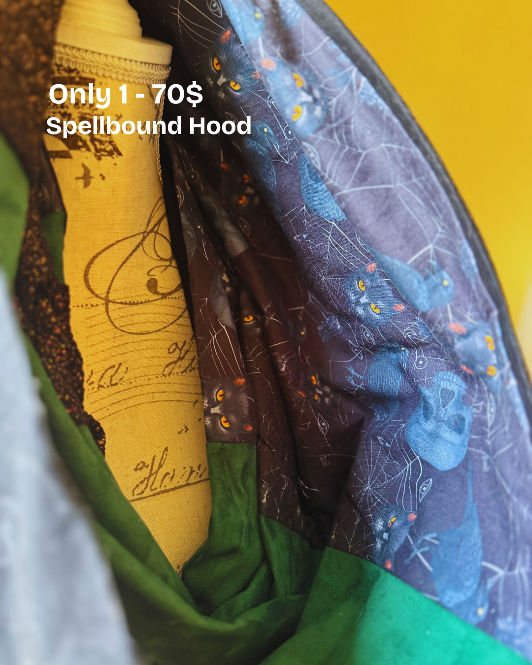 Wrap yourself in mystique with this enchanting hood, featuring a sleek black cotton exterior that gives way to a soft, serene green interior. Accented with glittering fabric, this piece is elevated by unique witchy fabric details, including cat silhouettes, crosses, and astrology symbols. Perfect for those who weave magic into their daily lives, this hood is a wearable talisman for the mystical and mysterious.
